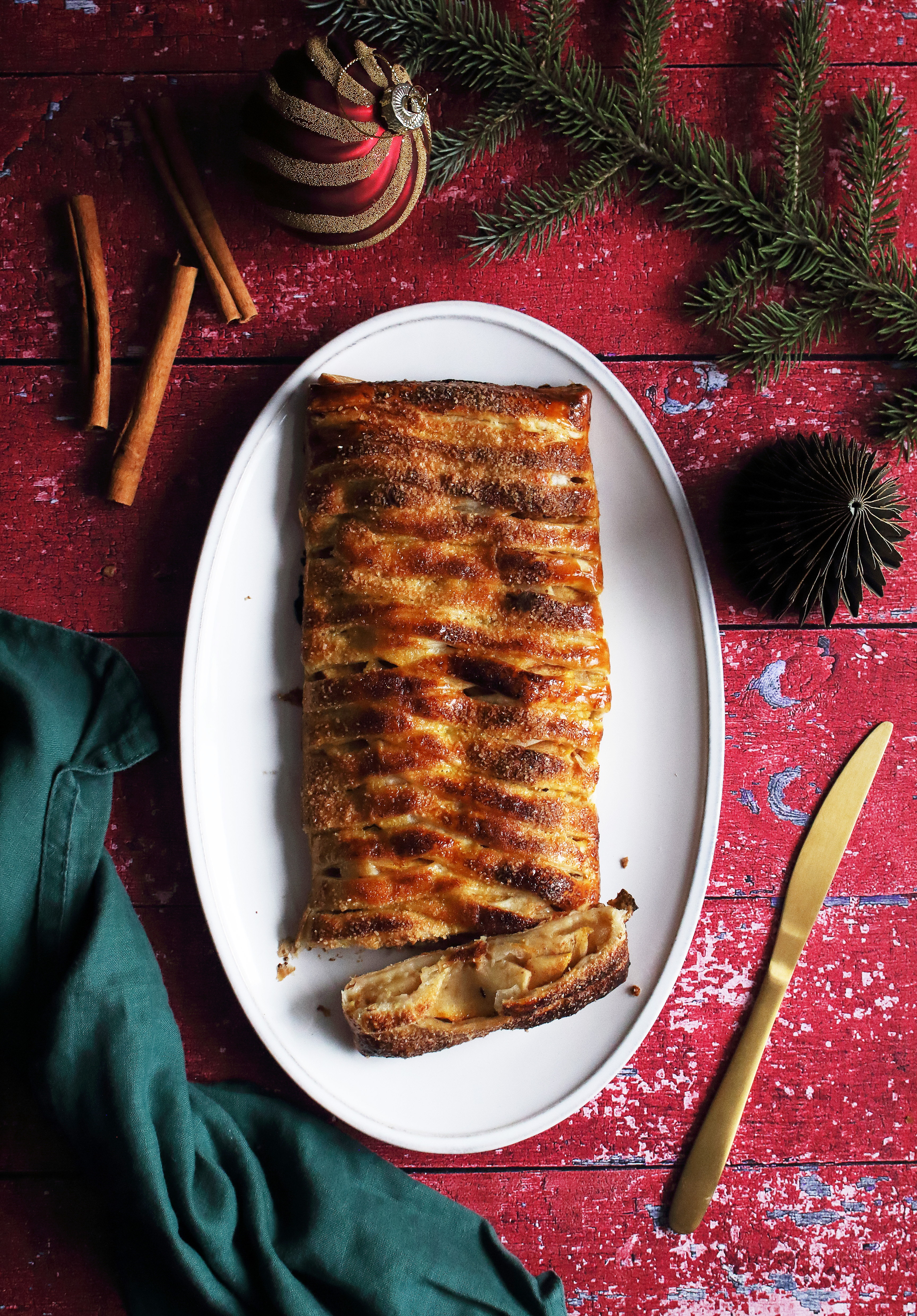 Petite explication: mettre la pâte feuilletée à l'horizontale (c'est à dire que les bords les plus courts soient de chaque côté), diviser la pâte en 3 en faisant un petit marquage au couteau MAIS NE PAS COUPER LA PÂTE ! (pour avoir 3 parties), mettre la compote de pommes au centre, ensuite les tranches de pommes à la cannelle. A l'aide d'un couteau, couper le côté gauche et le côté droit en lamelles de pâte épaisse et SANS LES DÉTACHER DU CENTRE, puis faire une tresse.