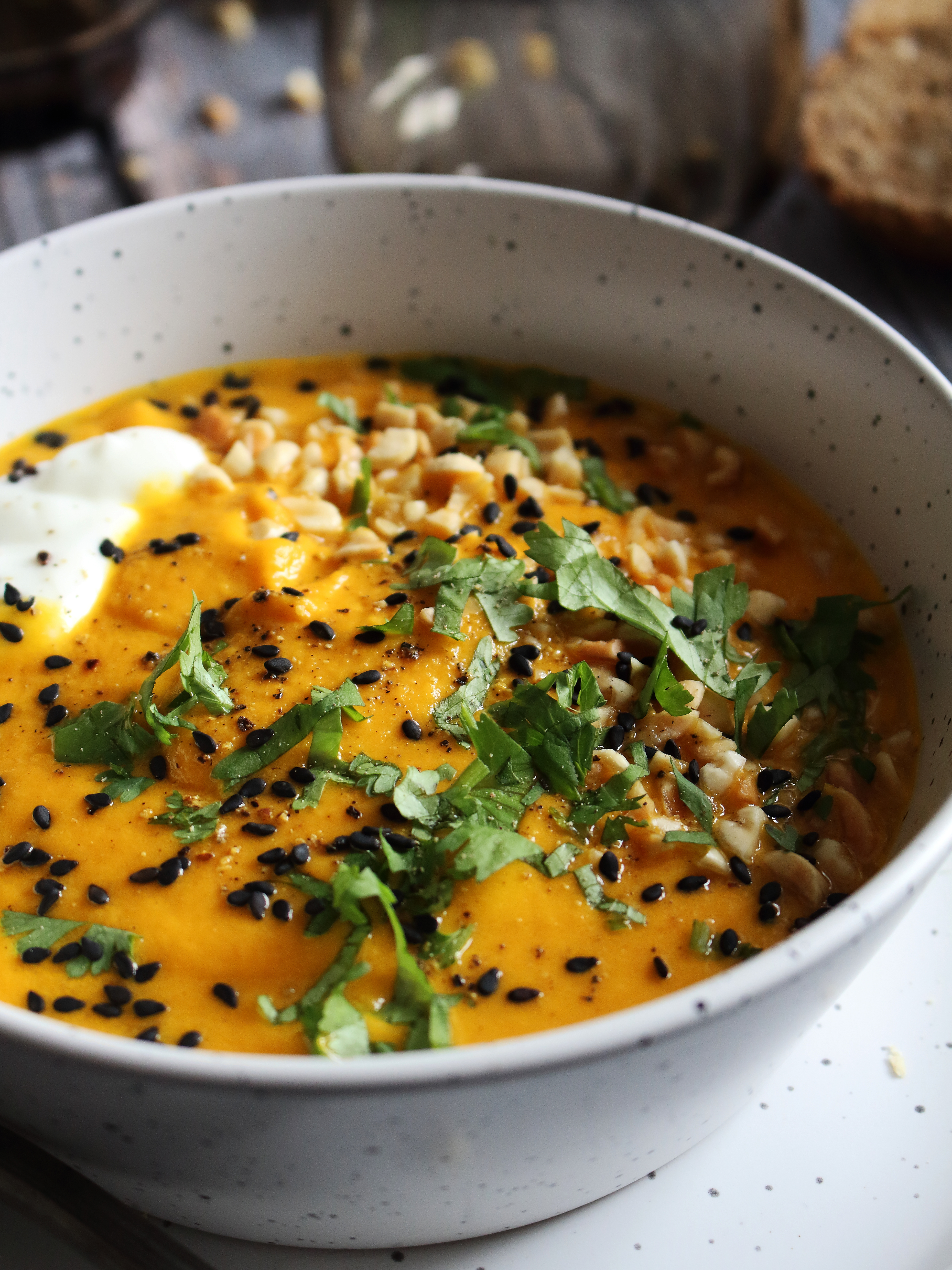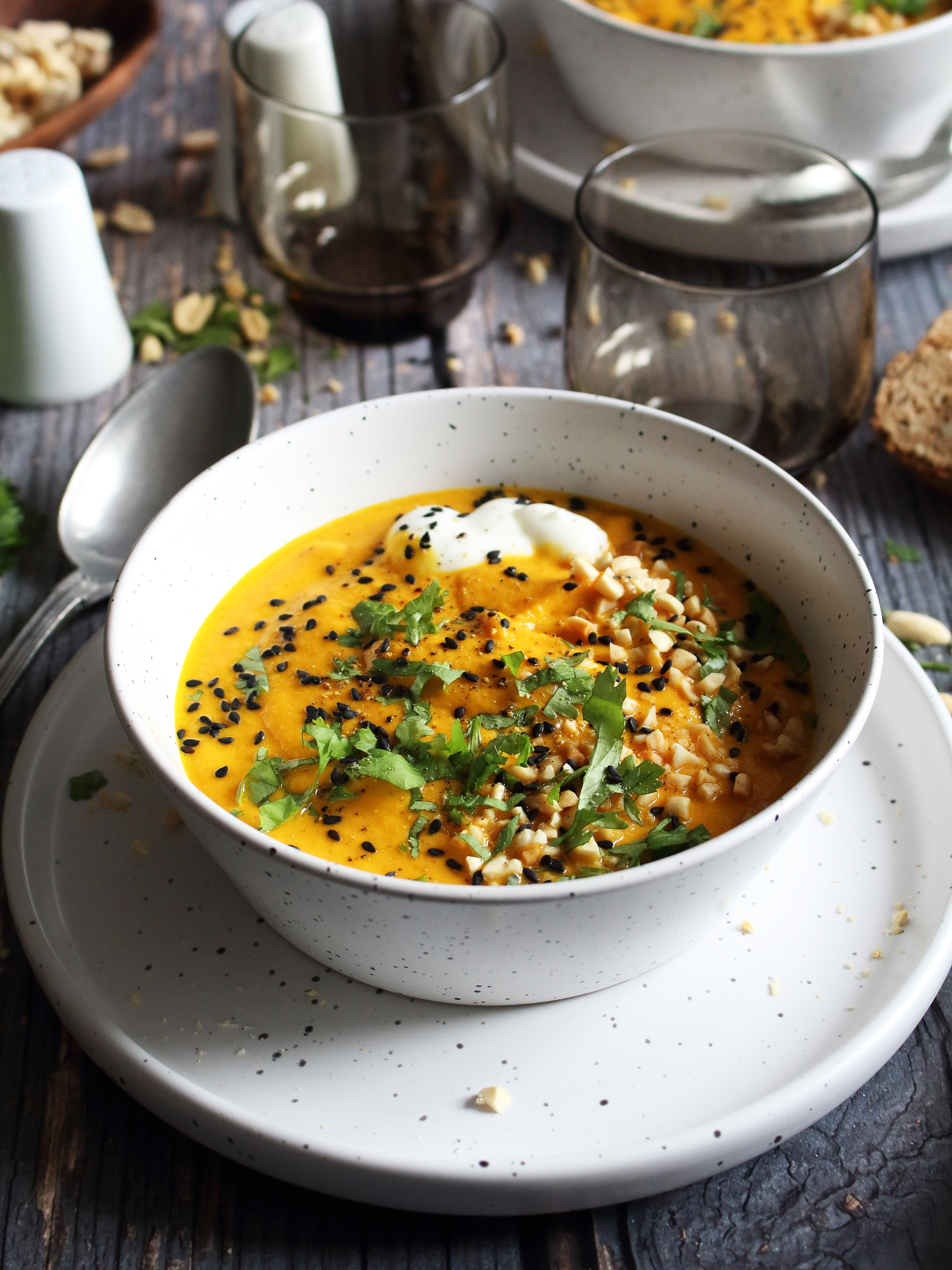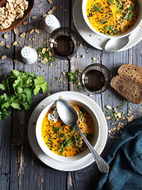 Se blottir sous un plaid bien au chaud pour déguster ce velouté onctueux de carottes au lait d'amandes et beurre de cacahuètes. L'association carottes au lait d'amandes est vraiment incroyable (tout comme le lait d'avoine d'ailleurs), cela apporte une légèreté au velouté. Le beurre de cacahuètes est présent pour apporter aussi un peu de douceur et d'exotisme avec un peu de coriandre.