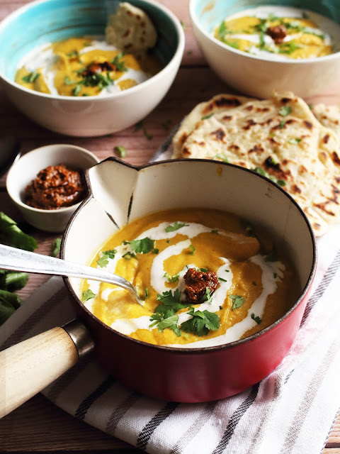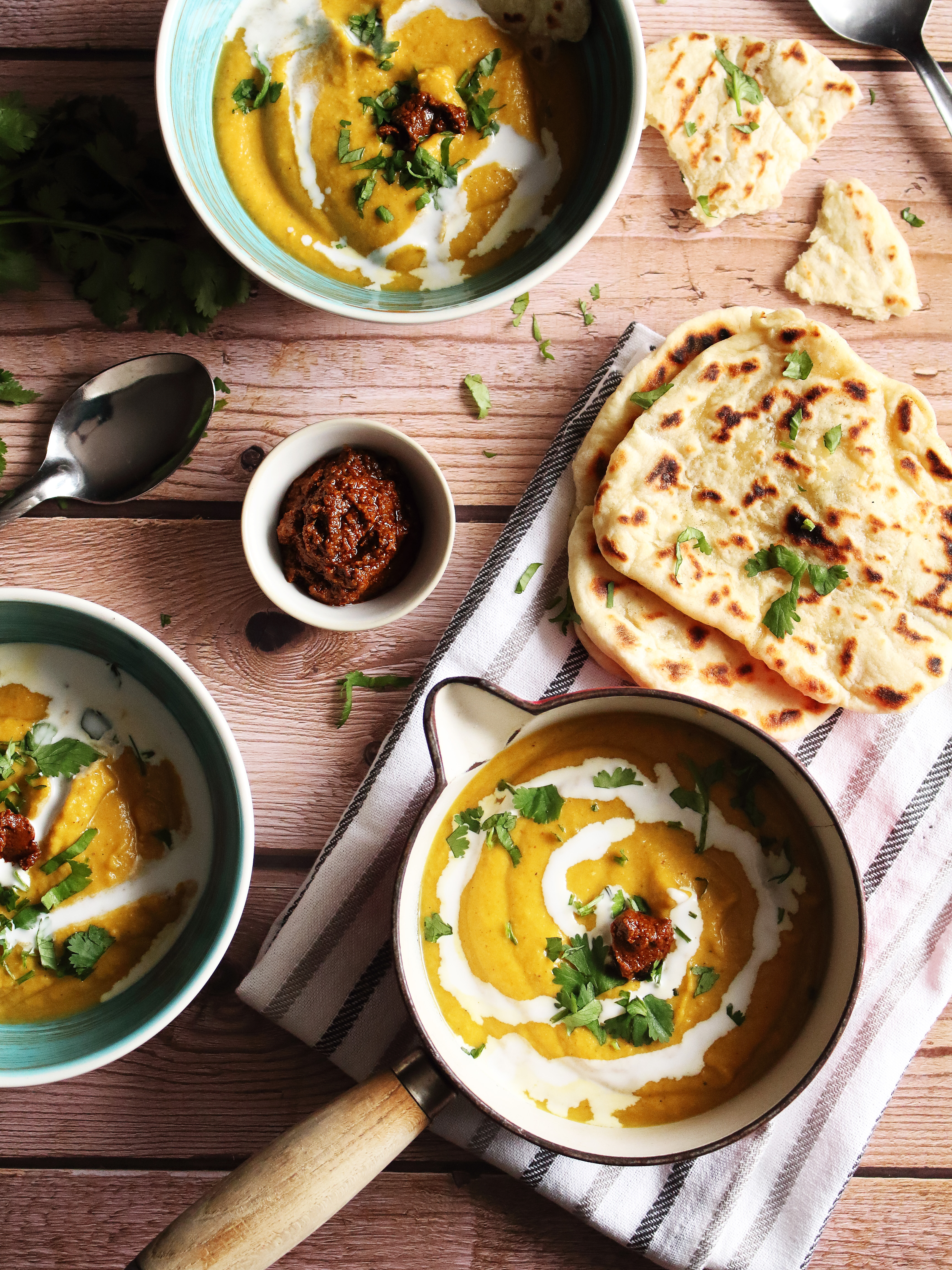 Je sers ce velouté avec des naans au fromage ou nature. D'ailleurs ma recette c'est par ici ->clic