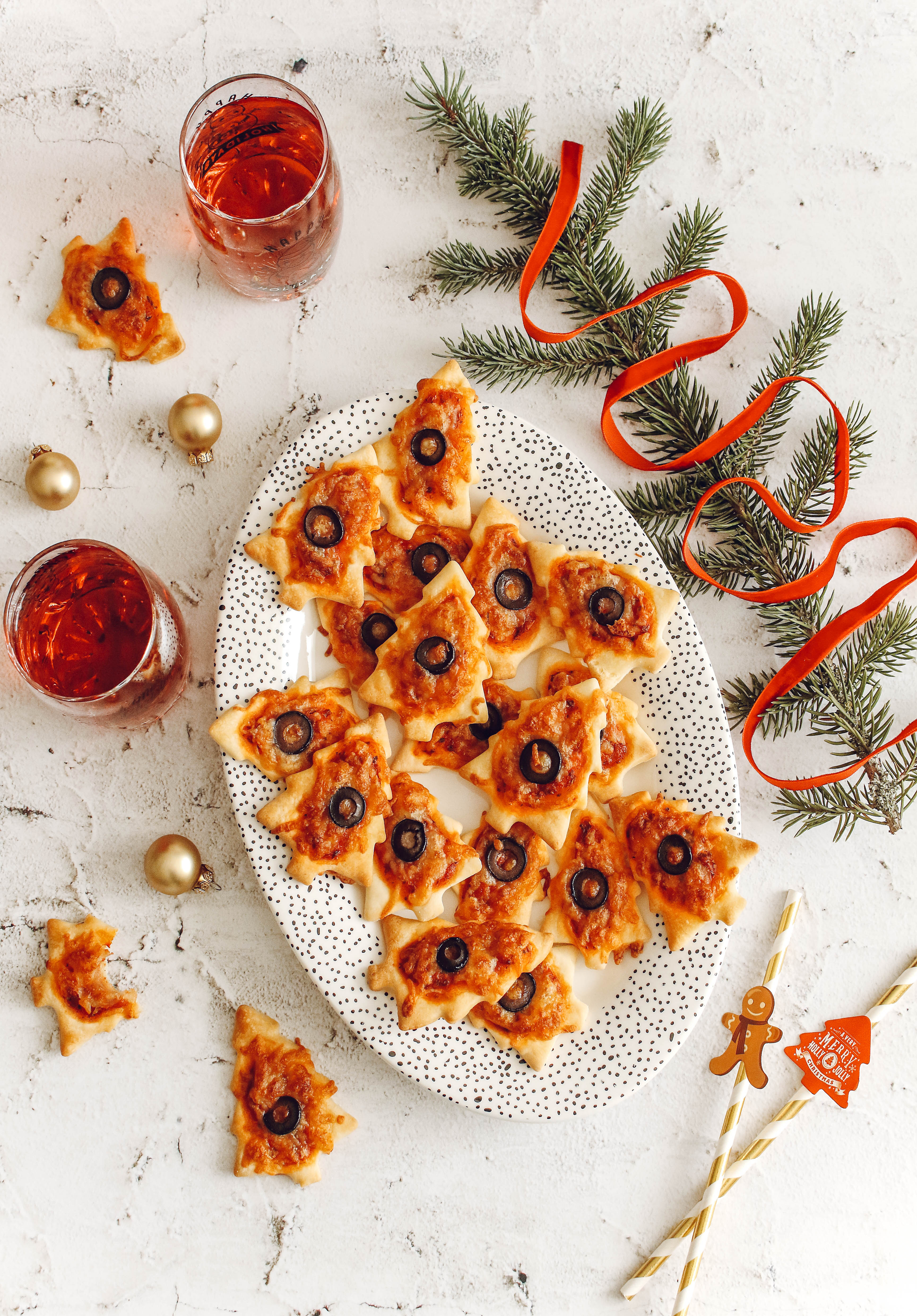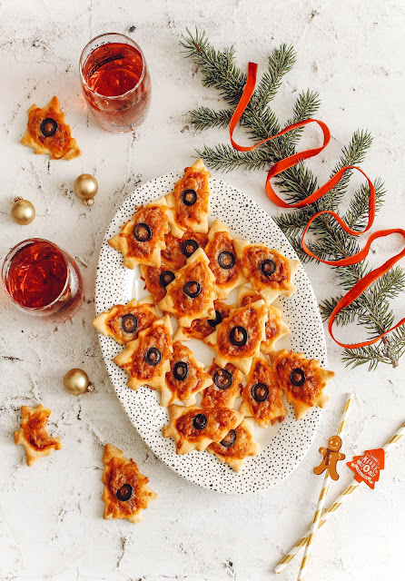 - Nappez d'un petit de sauce passata au centre des sapins, parsemez de mozzarella et ajoutez une rondelle d'olive.