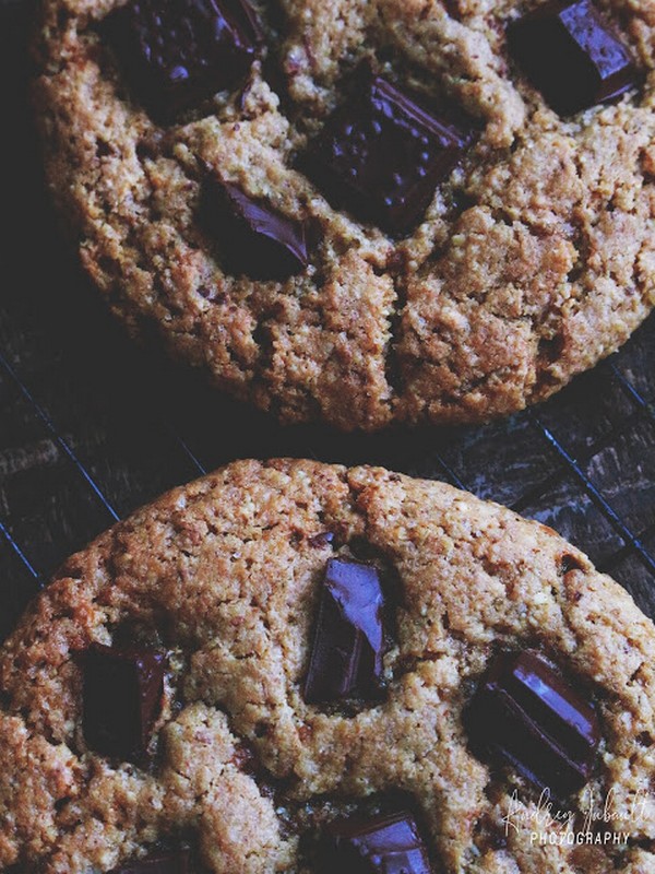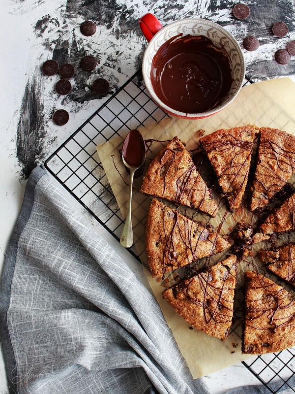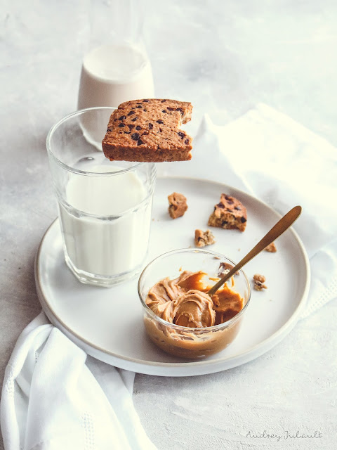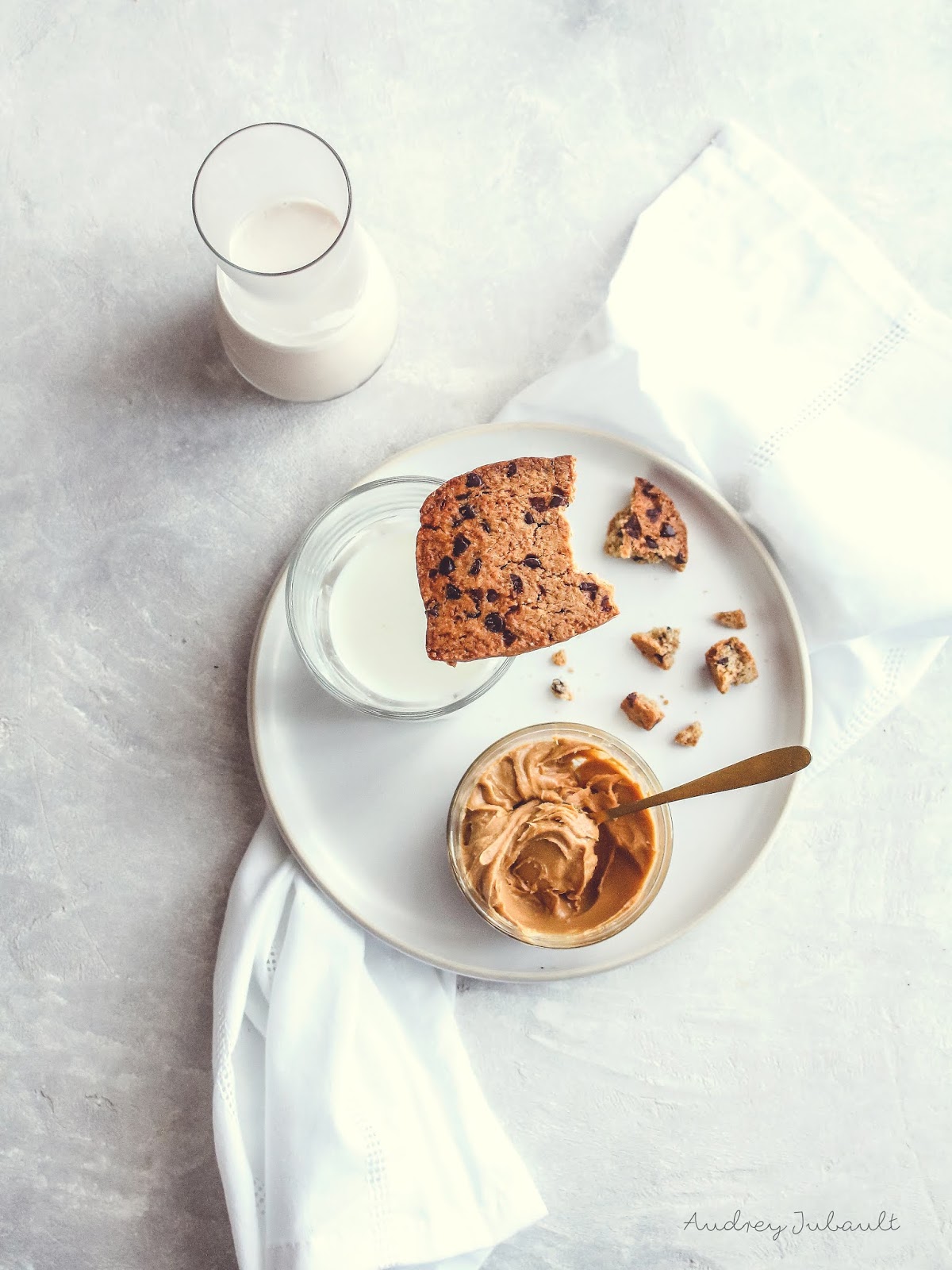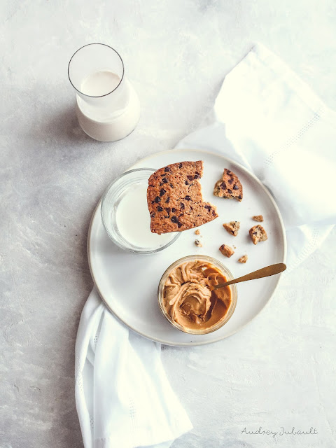 Un bon cookies géant à partager à l'okara de noisettes-amandes ( (l'okara est la pulpe obtenue des fruits secs lors de la réalisation du lait végétal et ici c'est suite à mon lait de noisettes-amandes) qui apporte une texture moelleuse, de la farine d'épeautre (riche en fibres et vitamines et a une faible teneur en gluten), et des palets de chocolat pour l'effet coulant dans tout le cookies.