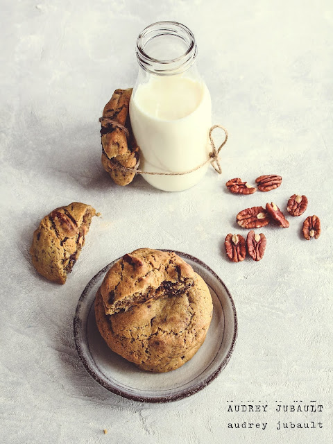 Pour cette recette, les cookies sont dodus, au chocolat noir et des morceaux de noix de pécan. Ils ne sont pas rester longtemps dans la boîte à biscuits.